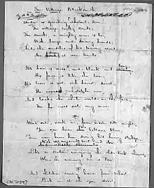 Much of Longfellow's work is categorized as lyric poetry, but he experimented with many forms, including hexameter and free verse.[92] His published poetry shows great versatility, using anapestic and trochaic forms, blank verse, heroic couplets, ballads, and sonnets.[93] Typically, he would carefully consider the subject of his poetic ideas for a long time before deciding on the right metrical form for it.[94] Much of his work is recognized for its melodious musicality.[95] As he says, "what a writer asks of his reader is not so much to like as to listen".[96]