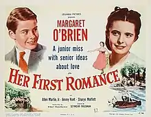 Her First Romance is a 1951 American drama romance film directed by Seymour Friedman and starring Margaret O'Brien, Allen Martin, Jr., Jimmy Hunt and Ann Doran.[1]