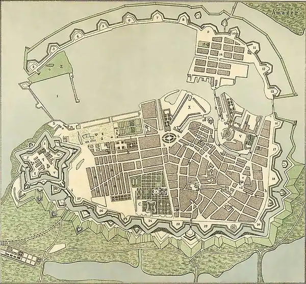 In 1581 Christopher Valkendorf supervised the largest expansion of the ramparts in the history of the city, as with the invention of cannons vastly extended earth ramparts were required.[13]
