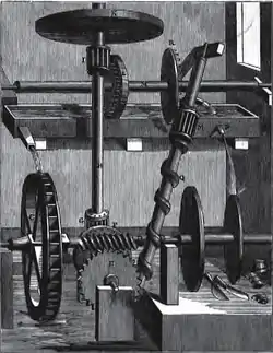 In 1812, Charles Redheffer, in Philadelphia, claimed to have developed a "generator" that could power other machines. The machine was open for viewing in Philadelphia, where Redheffer raised large amount of money from the admission fee.[13] Redheffer moved his machine to New York, after his cover was blown in Philadelphia, while applying for government funding.[14] It was there that Robert Fulton exposed Redheffer's schemes during an exposition of the device in New York City (1813). Removing some concealing wooden strips, Fulton found a catgut belt drive went through a wall to an attic. In the attic, a man was turning a crank to power the device.[15][16][17]
