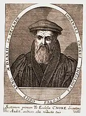 The humanist concern with increasing public access to education was shared by the Protestant reformers, who saw schools as vehicles for the provision of moral and religious education for a more godly society. After the Protestant party became dominant in 1560, the First Book of Discipline set out a plan for a school in every parish, but this proved financially impossible.[12] In the burghs the existing schools were largely maintained, with the song schools and a number of new foundations becoming reformed grammar schools or ordinary parish schools. Schools were supported by a combination of kirk funds, contributions from local heritors or burgh councils and parents that could pay. They were inspected by kirk sessions of local elders, which checked for the quality of teaching and doctrinal purity.[13] There were also large number of unregulated private "adventure schools". These were often informally created by parents in agreement with unlicensed schoolmasters, using available buildings and are chiefly evident in the historical record through complaints and attempts to suppress them by kirk sessions because they took pupils away from the official parish schools. However, such private schools were often necessary given the large populations and scale of some parishes. They were often tacitly accepted by the church and local authorities and may have been particularly important to girls and the children of the poor.[14] Outside of the established burgh schools, which were generally better funded and more able to pay schoolmasters, masters often combined their position with other employment, particularly minor posts within the kirk, such as clerk.[13] Immediately after the Reformation they were in short supply, but there is evidence that the expansion of the university system provided large numbers of graduates by the seventeenth century. There is evidence of about 800 schools for the period between 1560 and 1633. The parish schools were "Inglis" schools, teaching in the vernacular and taking children to the age of about 7, while the grammar schools took boys to about 12.[3] At their best in the grammar schools, the curriculum included the catechism, Latin, French, Classical literature and sports.[15]