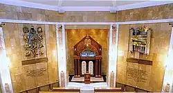 The interior of the building was designed by Frank Meisler, too. Meisler created wall sculptures showing Jerusalem, the Twelve Tribes of Israel and the Five Books of Moses.