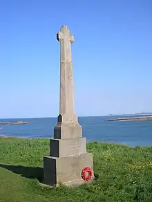 Holy Island War Memorial is a Lutyens War Cross design, constructed of pink ashlar from nearby Doddington, the same material used for Lindisfarne Priory. The construction work was undertaken by a Mr Tolly of Belford, Northumberland. The cross is formed of a tapered, lozenge-shaped shaft approximately 5 metres (16 feet) tall with short arms near the top linked to it with cyma moulding. The shaft rises from a base of three square stones, which stand on a single circular step. The central stone bears the inscription: "TO THE GLORY OF GOD / AND IN GRATEFUL MEMORY OF / OUR GLORIOUS DEAD / 1914 – 1918" on the east face; the inscription "TO THE GLORY OF GOD / AND IN GRATEFUL MEMORY OF / OUR GLORIOUS DEAD / 1939 – 1945" was added later in memory of the dead from the Second World War. Beneath the inscriptions, on the lower stones of the base, are the names of Lindisfarne's war dead.[1]