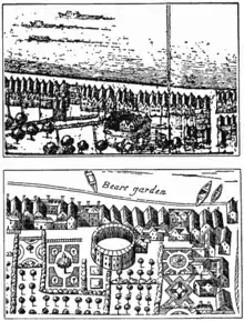 By one (questionable) account, the Hope Theatre was "pulled down to make tenements, by Thomas Walker, a petticoat maker in Canon Street," on Tuesday, 25 March 1656.[6] Yet the practice of animal sports resumed at the Restoration in 1660; if the Hope had been torn down, a replacement facility was soon established. The Diary of Samuel Pepys records a visit Pepys and his wife made to the Beargarden on 14 August 1666.[7] The last word of animal sports at the facility dates from 12 April 1682. By 1714, a development called Bear Garden Square had been built on the site of the old Hope.