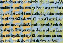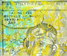 Until then Keining’s work had been characterized by the well-thought-out processing of specific subject areas (series, work groups). From this point on, however, he created instead individual pictures that combined in different ways elements such as flowers, animals, ornaments, but also comics and advertisements from the 1950s. Again and again script appeared as an element of the pictures. Keining used several slides projected one after another onto the canvas for the composition of the pictures. Some portions of the pictures are characterized by sprayed paint, others by brushed paint. The overlay of the portions leads to the impression of two or more visual levels in the pictures; e.g., the sharp silhouette of painted script stands out in front of a sprayed blurred ornament in the background. As the sprayed application of paint already blurs the contours more or less, the overlay of portions of the pictures increases the blur. This approach elicits great ambiguity undermining definitive interpretations.