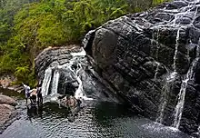 Baker's Falls, a waterfall formed by Belihul Oya, a tributary of the Walawe River is named after Sir Samuel Baker, a hunter and explorer[25] who attempted to establish a European agricultural settlement at Nuwara Eliya. The waterfall is 20 metres (66 ft) high. Slab Rock Falls is another well-known waterfall in the plains. The waterfall can be reached by walking on one of the main trails; the trail is a bit steep at the end but the difficulty level is medium to easy.[6]