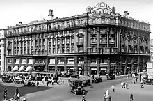 The Hotel National was financed by The Varvarinskoe Joint-Stock Company of Householders[1] and designed by architect Alexander Ivanov. Construction began in 1901 and the 160-room hotel opened on January 14, 1903. The hotel's opening is sometimes listed as January 1, because Russia was still using the Julian calendar at the time, which was 13 days behind the Gregorian calendar used in the rest of the world.[2] In 1915 the hotel made plans to add two floors on top of the six-story structure, but shortages caused by World War I meant that the work was never begun.[3]