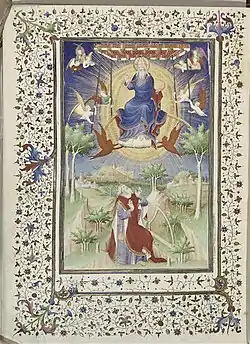 He also had his emblem of an eagle spreading his wings added to many of the folios. This was unusual because people of Jean de Boucicaut's station do not display their emblems so often, especially in a book of hours which is supposed to be contemplative instead of boastful. Jean de Boucicaut's motto was “ce que vous voudrez” which translates to English as “whatever you want”. Marshal Boucicaut had this motto put on many of the illuminations, however the most recent owner of the book of hours after Boucicaut (Aymar de Poitiers) had this motto blacked out along with Boucicaut's emblem.[1] In the Adoration of the Magi