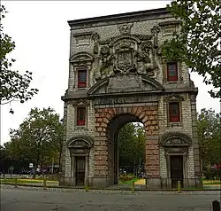 A few years after becoming a master, van den Eynde was commissioned to work on the Waterpoort in Antwerp, a triumphal arch or gate in honor of Charles V. The commission was completed by van den Eynde in collaboration with Hans van Mildert, a regular collaborator of Rubens. The design of the gate has been attributed to Rubens. The Waterpoort, or Porta Regia, was erected in 1624.[2][16] In 1883-84, due to works to the quays on the Scheldt, the gate was moved to the Sint-Jansvliet. In 1933, due to the works to the Scheldt tunnel, it was dismantled again and re-erected in 1936 on the Gillisplaats.[5]