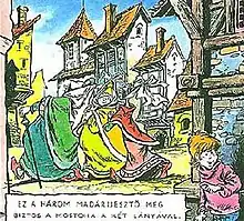 - Ákos Garay (Pusztaapáti, October 3, 1866 – Budapest, January 25, 1952)[16] painter, graphic artist, ethnographer. From 1883 he drew caricatures for most of the humor magazines (Kakas Márton, Bolond Istók, Fidibusz, Üstökös, Urambátyám, Magyar Figaró, Herkó Páter), Borsszem Jankó published his works for over 20 years. His early drawings were in a realistic style, later used distortion as an instrument for caricatures and humorous pictorial stories.[17] One of the fundamental artists who helped Hungarian pictorial stories to reach its classic stage.[18]