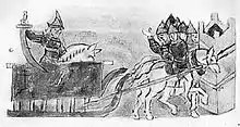 Following this, a gift made by the Grand Prince to Davyd Igorevich, which included land in Volhynia and control of trade with the Byzantine Empire, is said to have made Yaropolk hostile to the Grand Prince. By 1085 Vsevolod and Yaropolk are reported to have become entrenched against each other, and Vsevolod ordered his son, Vladimir Monomakh to march against Yaropolk.[15] Lacking confidence in his own resources, Yaropolk fled Volhynia to Poland, leaving his followers (and mother) at Lutsk.[16] Vladimir captured Lutsk and Yaropolk's family, attendants and treasure, and assigned his whole principality to Davyd Igorevich.[17]