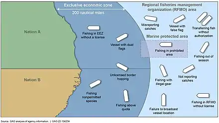 Fisheries crime is a concept related to Illegal, unreported and unregulated fishing (IUU) but includes all criminal activity that is common along the entire value chain of the fishing sector.[49] The concept has been adopted in several international organizations, most importantly the United Nations Office on Drugs and Crime (UNODC).[50] Proponents of the concept argue for increased international cooperation and the application of criminal justice sanction towards fisheries crime to face the problems that the transnational nature and the increased involvement of organized crime groups in the fishing industry cause.[51]