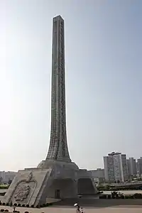 This monument was erected in 1997 in memory of Kim Il-sung, who died in 1994, covering a total area of 17000 m2 and extending with two arches over the artery leading to his mausoleum, the Kumsusan Palace, near the Ryonghung crossroads. It stands on a 10.50-metre-high, two-bay arch-shaped plinth through which road traffic passes on its way to the mausoleums of Kim Il-sung and Kim Jong-il. The tower is 82 metres high. On both sides of the tower are inscriptions in the form of a bronze relief. Originally, the inscriptions referred only to the "eternal president" Kim Il-sung, but they were changed after Kim Jong-il's death and the obelisks now contain the names of the two North Korean leaders.