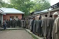 Voters standing in a queue for their turn to cast votes at a polling booth of Budgam, Srinagar in Jammu & Kashmir