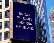 The technology company Facebook, Inc.,[lower-alpha 1] held its initial public offering (IPO) on Friday, May 18, 2012.[1] The IPO was one of the biggest in technology and Internet history, with a peak market capitalization of over $104 billion.