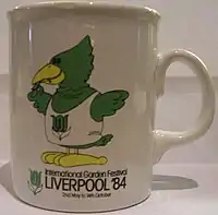 Commemorative coffee mug from the festival, showing a cartoon Liver bird.