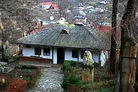 Ion Creangă was born in Humulești in the Principality of Moldavia, a former village which has since been incorporated into Târgu Neamț city, the son of Orthodox trader Ștefan sin Petre Ciubotariul and his wife Smaranda.[1] His native area, bordering on heavily forested areas,[2] was in the Eastern Carpathian foothills, and included into what was then the Principality of Moldavia. The surrounding region's population preserved an archaic way of life, dominated by shepherding, textile manufacturing and related occupations,[3] and noted for preserving the older forms of local folklore.[4] Another characteristic of the area, which left an impression on Creangă's family history, was related to the practice of transhumance and the links between ethnic Romanian communities on both sides of the mountains, in Moldavia and Transylvania: on his maternal side, the writer descended from Maramureș-born peasants,[5] while, according to literary historian George Călinescu, his father's origin may have been further southwest, in Transylvania-proper.[2]