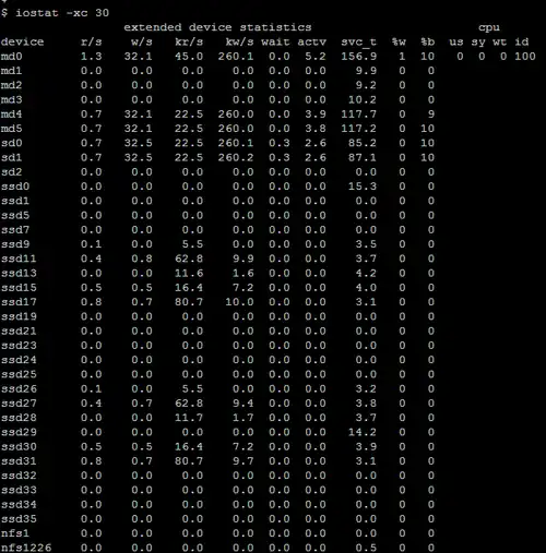 iostat -x displays output where each line (row) gives numerical data for one device. The first column lists the device name, and subsequent columns show various statistics for that device. Columns include the average service time (svc_t, which includes not only the time a request is in the service queue, but also the seek time and transfer time[2]), the average busy percentage (%b, essentially the proportion of time that the device is in use), and the percentage of time that the queue is not empty (%w, which means the proportion of time in which requests from the device have not yet been fulfilled).[1]