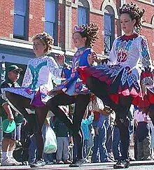 Irish stepdance is a style of performance dance with its roots in traditional Irish dance. It is generally characterized by a stiff upper body and fast and precise movements of the feet. It can be performed solo or in groups. Aside from public dance performances, there are also stepdance competitions all over the world. These competitions are often called Feiseanna (singular Feis). In Irish dance culture, a Feis is a traditional Gaelic arts and culture festival. Costumes are considered important for stage presence in competition and performance Irish stepdance. In many cases, costumes are sold at high prices and can even be custom made. Each costume is different, with varying colors and patterns, designed to attract the judge's eye in competitions and the audience's eye in performance. General appearance beside the costume is also equally important. Female dancers would typically curl their hair before each competition or wear curled wigs, while male dancers would neatly style their hair to a shape to their liking. Poodle Socks are worn by female dancers while males wear plain black socks. Poodle socks are white socks that stretch to typically 1-4 inches above the ankle, depending on the dancers preference. They also have distinctive ribbing, and can be embroidered with gems.