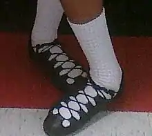 In the latter half of the 20th century, the pumps changed to a low cut type with crossed laces similar to the Scottish ghillie. This modern type of shoe, however, differs from the traditional Scottish footwear with a shorter toe box and round laces. A number of variations on this type are available, including variants with softer leather and split soles.[29] This change was motivated by a desire to highlight the position of feet to adjudicators, as the usual black colour of the pumps contrasted with the exposed white of the poodle socks.[31] The flexible nature of these shoes enables rapid and graceful movement as well as elevation in the dancer's performance.[20]