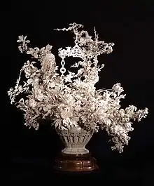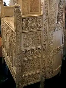 Apart from the small objects, ivory carvings was also used in furniture, containers, building elements and carved boats mounted on display stands.[24] One of the exquisite example of ivory carved chair can be seen in Salar Jung Museum, this chair was gifted to Tipu Sultan by King Louis XVI and later acquired by Salar Jung III in 1949.[25] Significant examples of use of ivory in building elements can be seen in the Darshani Door at Sri Harmandir Sahib at Amritsar[26] and the entrance door at the Mausoleum of Tipu Sultan.[27]