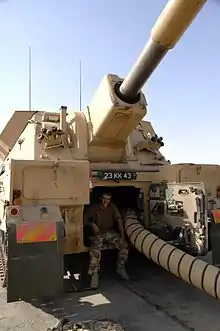 J Battery, 3rd Regiment, Royal Horse Artillery fire rounds to calibrate their AS-90 155 mm self-propelled guns in Basra, Iraq, August 28, 2008.