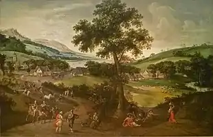 In his earliest landscape drawing of a View over a tree-covered hill towards a village on a river (1573, Kunsthalle Hamburg) and in the series of paintings of the Four Seasons (1577, Museum of Fine Arts (Budapest) Jacob Grimmer showed a preference for depicting realistic flat Flemish landscapes with villages and farmhouses and populated with rural residents.[7] The small figures in these scenes are set in graduated zones of recession along rolling hills towards a horizon in the middle of the panel.[8] These landscapes with figures and small anecdotal scenes are rendered in a naturalist manner. Grimmer abandoned the contrived world landscape of the earlier generation in favour of a simplicity and authenticity never seen before.[2]