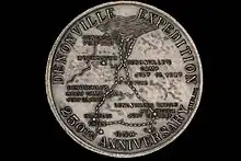 A medal commemorating the 250th anniversary of the 1687 Denonville Expedition was created by the Rochester Numismatic Association in 1937.[13] The obverse has an image of the Marquis de Denonville while the reverse shows the timeline and path of the expedition.