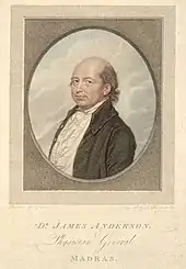 James Anderson (17 January 1738–6 August 1809[1]) was a Scottish physician and botanist who worked in India as an employee of the East India Company. During his career in India, he was involved in establishing a botanical garden at Mambalam, Madras, originating from a nopalry or Opuntia garden where he made attempts to introduce the cultivation of cochineal insects. He then attempted to introduce various other economically valuable plants, and examined silk and lac production. He maintained a steady communication with his friend from youth, James Anderson LLD (1739–1808) who published some of his notes in The Bee, or Literary Weekly Intelligencer, which has led to the use of the distinguishing form James Anderson MD or James Anderson of Madras.