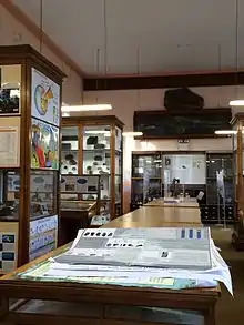 The museum is now housed in one room, formerly the Geographical Museum.[4] The museum contains specimens of rocks, minerals and fossils, which primarily serve as an educational resource for the students and staff of the University of Galway, but also primary and secondary school children.[7] There are approximately 5000 fossils and 3000 rocks and minerals within the collections.[8] The collections are of particular interest to the study of Irish geology.[6] Much like the Natural History Museum in Dublin, the gallery is in the Victorian cabinet style, a "museum of a museum".[5] The collections were intended to be representative of international geology, with examples from all around the world. The palaeontological collections include a plesiosaur from Lyme Regis, a German ichthyosaur, and Kiltorcan Devonian flora from County Kilkenny. More recent acquisitions include the Dave McDougall collection, reflecting the current focus on collecting local specimens.[3]