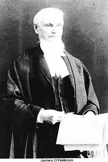 James O'Halloran, KC (c.1820 – June 1, 1913) was a Quebec lawyer and political figure. He was born about 1820 (some sources say 1821) near Fermoy, County Cork, Ireland and came to Canada with his family in 1828. He studied at the University of Vermont and served in the U.S. Army during the war with Mexico. He returned to Lower Canada in 1849, was admitted to the bar in 1852 and set up practice in Cowansville. He was elected to the Legislative Assembly of the Province of Canada for Missisquoi as a member of the parti rouge; he was reelected in 1863. He opposed Confederation. O'Halloran was named Queen's Counsel on February 12, 1864.