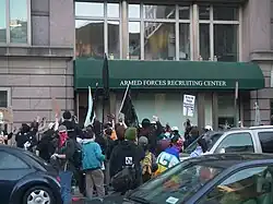 In the late afternoon, approximately 30 demonstrators marched to the Armed Forces Recruiting Center at 14th street. The window at the recruitment center was smashed,[5] and the demonstrators dispersed soon afterward.