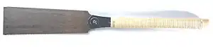 - Japanese saw (鋸, nokogiri), which cuts on the pull stroke, rather than the otherwise globally prevalent push stroke. This allows the blades to be quite thin in comparison to the Western saw. There are two main kinds of cutting teeth on Japanese saws: crosscut (横挽き, yokobiki) and rip (縦挽き, tatebiki). The rip and crosscut are combined in one blade, known as a ryoba (両刃, lit. 'dual edge'). The rip and crosscut patterns are also made in single-edged saws, kataha nokogiri (片刃), both with stiffening back pieces and without. The stiff-backed saws, known as douzuki (胴付き, lit. 'attached trunk') are typically used in cutting fine joinery. There are many other types of Japanese saws as well: osae-biki (押さえ引き鋸, lit. 'press-cut saw'), used for flush-cutting pegs to a surface without marring the surface. The saw teeth have no set to one or both sides to accomplish this feat. There is the azebiki (畔挽き, lit. 'ridge saw'), which has cutting both rip and crosscut teeth, and is short and rounded in profile. It is used for sawing in confined areas and starting cuts in the middle of surfaces. There are many other types and sub-types of saw. Most saws sold in the West are mass-produced items with induction-hardened teeth and relatively cheap replaceable blades. The handmade forged saws are very laborious to make and involve more manufacturing steps in the forging to complete than planes or chisels.