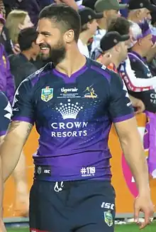 He made his NRL debut against the Cronulla-Sutherland Sharks in round 1 of the 2010 NRL season.[14][15] He played in seven NRL matches during the season, and 21 matches in 2011, before signing an extension of his contract to play for Melbourne through the 2015 season.[16] In 2012, he played in Melbourne's Grand Final victory over Canterbury-Bankstown. He played in Melbourne's 2013 World Club Challenge victory over Leeds, scoring a try.