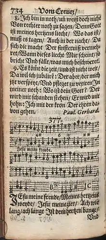 The hymn tune, Zahn 8032,[8] in E minor culminates in the long phrase of line 8 and repeats line 1 in line 9, framing the stanza.[9] One of the earliest choral settings occurs in the cantata BuxWV 60 by Dieterich Buxtehude, composed in the 1680s.[10] David Pohle set it for four voices, three instruments and continuo.[11]