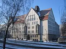 The first school in Chemnitz-Bernsdorf opened on 30 October 1822.[5] At the beginning of the 19th century, the village commune Bernsdorf became a suburb of the urban community Chemnitz. In 1805, school attendance became compulsory and the suburb was forced to build a school for the children. But with only 300 citizens in total living in Bernsdorf, the community was not able to finance and maintain their own school building. The children were required to attend a school in the urban core. Pastor Gottlob Heinrich Hunger bought a small house with his own funds to offer public education for children from Bernsdorf. The school building was inaugurated on 30 October 1822 and 60 students attended it at the beginning. Because of poverty during the industrialization in the middle of the 19th century, parents took their children to school in the factories. The minors had to work 12 to 14 hours a day and were able to attend school after that. The family had to pay around 6 groschen for each child. On account of the devastating situation in the school system, a committee with pastor St. Johannis at the head, started to supervise schools in Chemnitz. Children who didn’t attend school were reported to the royal Land court. Schools were included in the town's budget and supported children from poor families with teaching materials. This way, every child was given a chance to pursue education. The number of students being taught at the small building rose so that it eventually became too small.[5]