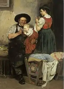 After arriving in Munich in 1859, he was enrolled at the Academy, where he studied with Philipp Foltz and Carl Theodor von Piloty. Under Foltz's tutelage, he created his first major painting in 1867: a scene from the version of Frithiof's Saga by Esaias Tegnér. This was followed by a dramatic scene depicting Margaret of Thuringia being cast out of her home, and one of Doctor Joseph-Ignace Guillotin, demonstrating the invention that would be named after him. By the mid-1870s, he had added sentimental genre scenes of domestic life to his repertoire. Later, he became active in the Arts and Crafts movement; designing chandeliers and other decorative pieces in collaboration with Adolf Halbreiter.