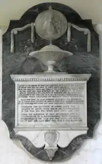 "Sacred to the memory of John Clevland Esqr. of Tapley in the county of Devon who for the space of forty years served his king and country with the greatest honor and fidelity the last seventeen years of which he was joint and sole secretary of the Admiralty in which office through a multiplicity of business and his constant application to the discharge of it he contracted a complication of disorders which occasioned his death at Tapley 18th June 1763. Near him here lie also enterred Elizabeth the daughter of Sr. Caesar Child, Baronet, of Gwin in Essex, with whom he intermarried in the year 1729 who dying left issue three sons and three daughters; Penelope the daughter of Joseph Davie Esqr. of Orleigh in Devon, with whom he intermarried in the year 1743 who dying left issue one son; Sarah the daughter of Chas. Shuckburgh Esqr. of Longborough in Gloucestershire with whom he intermarried in the year 1747 who dying his widow the 5th Decr. 1764 left issue two sons & two daughters"