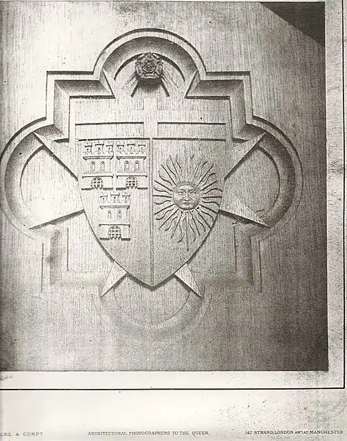 John de Havilland used a coat of arms recorded at the 1623 visitation of Gloucester. The arms are blazoned "Argent three Towers triple-towered Sable Portcullises Gules". As York Herald, de Havilland impaled these with his maternal arms of von Sonntag, blazoned "Azure a Sun in splendor proper" in the window of St Peter's Church, illustrated below, and used a Chief of Religion as a Knight of Malta in addition to setting his shield on the Maltese Cross. See image (4) below by Bedford Lemere & Co - a firm of British architectural photographers active in the late nineteenth and early twentieth century....