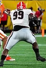 Davis played in 11 games with four starts as a true freshman, recording 25 tackles with 1.5 sacks and was named to the Southeastern Conference (SEC) All-Freshman team and a Freshman All-American by the Football Writers Association of America.[3][4][5] As a sophomore, he had 18 tackles, 4.5 tackles for loss and 2.5 sacks.[6][7] During the COVID-19 shortened 2020 season, Davis had 16 tackles and a sack while leading his team to a win in the 2021 Peach Bowl over Cincinnati.[8][9][10] Davis had his best season as a senior with 32 tackles (17 solo), two sacks, one pass defended, and a rushing touchdown.[8][11] After completing a perfect regular season, Davis and the Bulldogs fell to the Alabama Crimson Tide in the 2021 SEC Championship 41–24.[12] Despite their loss, Georgia was ranked as the third seed in the 2021 College Football Playoffs. They went on to defeat the second-ranked Michigan Wolverines in the 2021 Orange Bowl, creating a rematch against Alabama in the 2022 College Football Playoff National Championship.[13] Georgia defeated Alabama in the National Championship 33–18, claiming their first national championship since 1980.[14] Davis earned Consensus All-American honors for the 2021 season.[15] He won the Chuck Bednarik Award and the John Outland Trophy.[16][17]