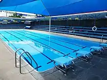 The swimming pool complex includes two rectangular, in-ground, concrete swimming pools and timber stands. The 1929 pool has slightly rounded corners. The complex is enclosed by early face brick and perforated concrete block walls to the south and east, a corrugated metal-clad timber-framed fence to the north, and a recent, face brick, changing room structure (2003, not significant) to the west. The oldest and smallest pool is the 1910 swimming pool, which runs on a north–south axis, measures 13 by 4.9 metres (43 ft × 16 ft), and is located west of the perpendicular, 1929 swimming pool, which measures 23 by 7.6 metres (75 ft × 25 ft). Both pools have tiled edges and concrete pavers around them. The stands comprise tiered, timber-framed seating that allow for the viewing of the 1929 swimming pool. The stands are sheltered by a metal-framed roof (1989) that is not of cultural heritage significance.[1]