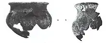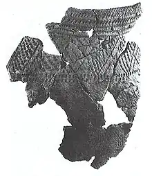 Eleven sherds representing a single vessel were present at Juntunen.[4] Ramey Incised is a Middle Mississippian pottery type first identified at the Cahokia Old Village site in southern Illinois. It has also been recovered at Carcajou Point in Wisconsin, but its presence at Juntunen marks the northernmost occurrence of any Middle Mississippian pottery type. Tempering is shell-tempered mixed with grit and decoration is a distinctive pattern of curvilinear designs. The vessel shape is thought to be a bowl with sharply defined shoulder. It was recovered in intermediate strata between the Bois Blanc and Juntunen Phases.[4][13]
