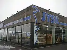 Jysk A/S (Danish: [ˈjysk] YUHSK) is a Danish retail chain, selling household goods such as mattresses, furniture, and interior décor. Jysk is the largest Danish retailer operating internationally with over 3,100 stores in 51 countries.[1] Jysk (meaning "Jutlandic") was founded by Lars Larsen, who opened the first store on Silkeborgvej in the Danish city of Aarhus in April 1979.[2] It is owned by the founder Lars Larsen's family through the holding company Lars Larsen Group which also owns wholly or partly the furniture chains ILVA , IDÉmøbler, IDdesign, Bolia.com, and Sengespecialisten.[3] The logo displays a goose, which has a historical thread to the brand.[4] Due to the Scandinavian design for its products, it is also called the Danish IKEA in a small format.[5]