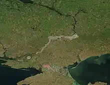 The reservoir covers a total area of 2,155 km2 (832 sq mi) in the Kherson, Zaporizhzhia, and Dnipropetrovsk Oblasts of Ukraine.[2] It is 240 km (150 mi) long and up to 23 km (14 mi) wide. The depth varies from 3 to 26 m (9.8 to 85.3 ft; 1.6 to 14.2 fathoms) and averages 8.4 m (28 ft; 4.6 fathoms). The total water volume is 18.2 km3 (4.4 cu mi). The Kakhovka dam has resulted in the natural water level of the Dnieper River being raised 16 m (52 ft).[3] Locals sometimes referred to the reservoir as the Kakhovka Sea as the other side of the river bank could not be seen at some points.[4]