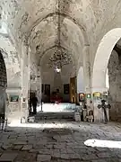 Khndzoresk is widely famous for its canyon with picturesque rock formations and ancient cave settlement. The artificial caves, some of which are currently used as stables and warehouses, used to be inhabited till the 1950s. In the bottom of the gorge there is St. Hripsime church, dating back to the 17th century. On a spur beyond on the right side of the gorge there is Anapat (hermitage) with the tomb of Mkhitar Sparapet. The cave church of St. Tatevos can also be found nearby.[3]