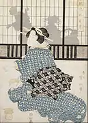 Kikukawa Eizan (菊川 英山, 1787 – July 17, 1867) was a designer of ukiyo-e style Japanese woodblock prints. He first studied with his father, Eiji, a minor painter of the Kanō school, and subsequently with Suzuki Nanrei (1775–1844), of the Shijō school. He is believed to have also studied with ukiyo-e artist Totoya Hokkei (1790–1850). He produced numerous woodblock prints of beautiful women (bijin-ga) in the 1830s, but then abandoned printmaking in favor of painting.