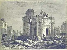 It was constructed at the junction of Gray's Inn Road, Pentonville Road and New Road (developed in 1765, and renamed Euston Road in 1857), in an area previously known as Battle Bridge, where York Way crossed the River Fleet, reputedly referring to a battle fought between Boudicca's rebellious army of Ancient Britons and soldiers of Ancient Rome.[3] It had an octagonal base with paired columns at each corner, a balustrade at first floor level intended to be decorated with four statues, one on each corner (either kings of England, or the patron saints of England, Scotland, Wales and Ireland; but it is not clear if any statues were ever put in place), rising to a pedestal with a clock. From 1835, it was surmounted by a statue of George IV. The statue stood 11 feet (3.4 m) high, on top of the 60 feet (18 m) high building.[4][5]