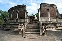 The Vatadages were built since the Anuradhapura period, however, the peak was reached during the Polonnaruwa period. The Polonnaruwa Vatadage is considered the "ultimate creation" out of all Vatadages. A Vatedage is built for the protection of a small stupa.[19] The structure has two stone platforms decorated with elaborate stone carvings. The lower platform is entered through a single entrance facing the north, while the second platform can be accessed through four doorways facing the four cardinal points. The upper platform, surrounded by a brick wall, contains the stupa. Four Buddha statues are seated around it, each facing one of the entrances. Three concentric rows of stone columns had also been positioned here, presumably to support a wooden roof. The entire structure is decorated with stone carvings. Some of the carvings at the Polonnaruwa Vatadage, such as its sandakada pahanas, are considered to be the best examples of such architectural features. Although some archaeologists have suggested that it also had a wooden roof, this theory is disputed by others.