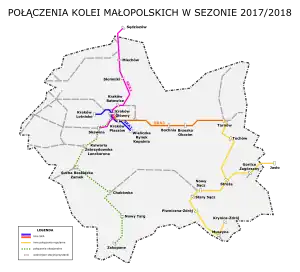 Between 2014 and 2018, Koleje Małopolskie, together with the Kraków High Speed Agglomeration Railway, gained three new routes:[6]