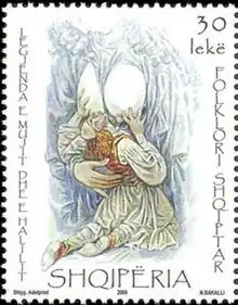 Scene of the zana feeding young Muji, depicted on a 2009 postage stamp of Albania.